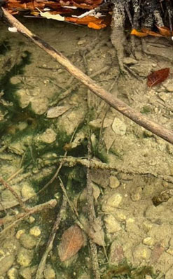 Abb.7: Benthische Cyanobakterien: dunkelgrüner Aufwuchs von fädigen Cyanobakterien aus der Gattung Oscillatoria (Bildquellen/Fotos: ©: Franziska Bauer, TU München)