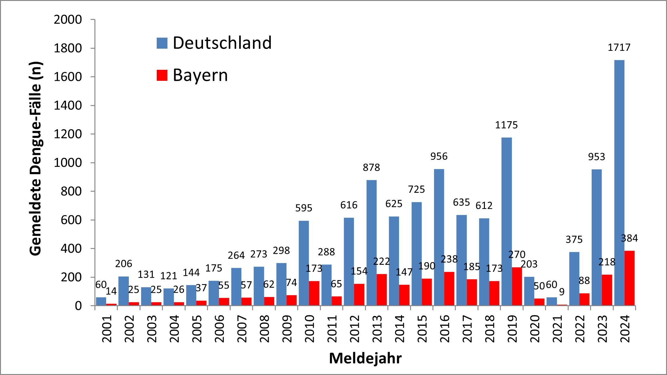 Der Anstieg der Fallzahlen in den Jahren vor der COVID-19-Pandemie ist multifaktoriell bedingt. Zum einen ist durch eine zunehmende Reisetätigkeit in Endemiegebiete, beispielsweise Südostasien, Afrika oder auch Mittel- und Südamerika, eine höhere Anzahl infizierter Reiserückkehrer zu verzeichnen. In Jahren, in denen es zu größeren Ausbrüchen in den Endemiegebieten kommt, spiegelt sich dies auch in der Fallzahl bei den Reiserückkehrern wider und führt zu den beobachteten „Peaks“, wie jüngst auch im aktuellen Jahr 2024.