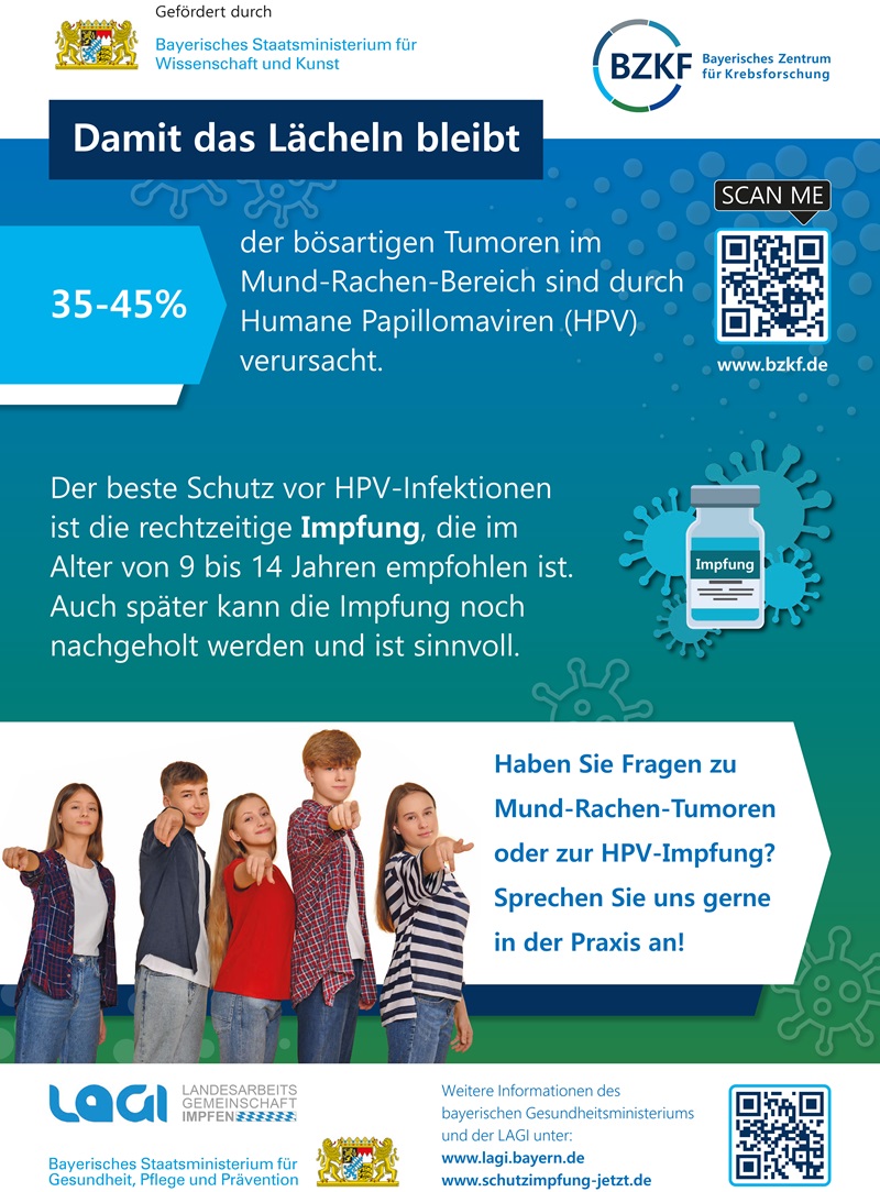 Gemeinsam mit dem Bayerischen Zentrum für Krebsforschung (BZKF) und dem Bayerischen Staatsministerium für Gesundheit, Pflege und Prävention (StMGP) hat die LAGI Aufklärungsmaterialien über die HPV-Impfung erarbeitet. Besonders im Fokus der Materialien steht dabei, dass HP-Viren auch Tumore im Mund- und Rachen-Bereich auslösen können und eine rechtzeitige Impfung auch vor diesen Tumoren schützen kann. Die seit Mai 2025 verfügbaren Informationsmaterialien sind daher besonders relevant für Praxen der Hals-Nasen-Ohrenheilkunde, Mund-Kiefer-Gesichtschirurgie und Zahnmedizin. Flyer und Plakate fürs Wartezimmer können kostenlos auf der Seite der BZKF bestellt werden.