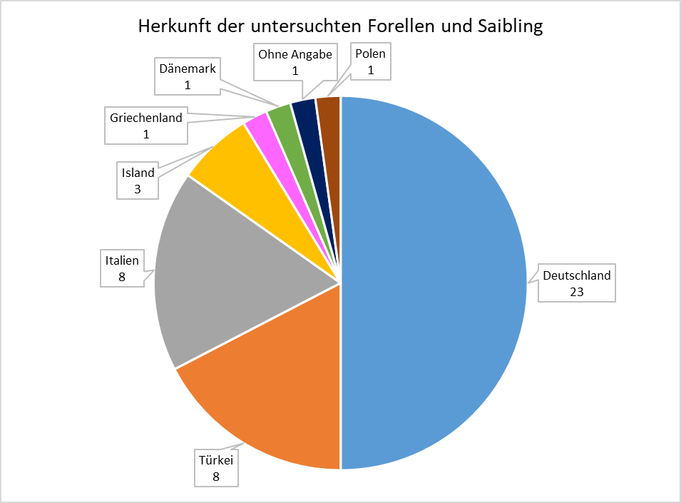 Natürlich untersuchte das LGL auch Forellen und Saiblinge anderer Herkunft, die über die Lebensmittelüberwachung im bayerischen Handel entnommen wurden. Insgesamt analysierten die LGL-Spezialisten 46 Fische, davon 33 Forellen und 13 Saiblinge. Eine Übersicht über die Herkunft der Proben bietet nachfolgende Abbildung.