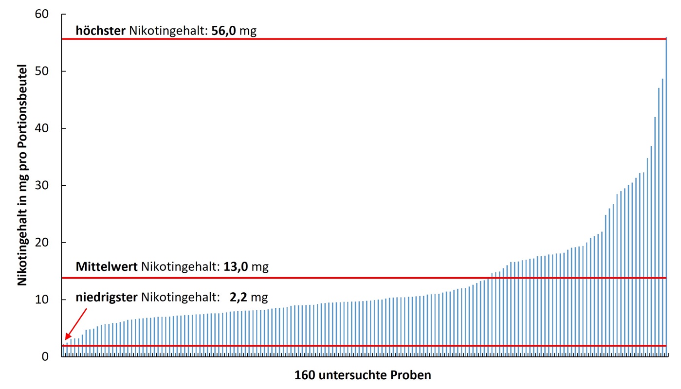 Von Januar 2020 bis November 2025 wurden dem LGL von den bayerischen Lebensmittelüberwachungsbehörden insgesamt 184 Nikotinbeutel mit unterschiedlichen Geschmacksrichtungen und Nikotinstärken zur Begutachtung vorgelegt. Da laut Deklaration in den Proben jeweils Nikotin enthalten war, wurde in 160 von 184 Proben der Nikotingehalt analytisch bestimmt. Bei den übrigen 24 Proben verzichtete das LGL auf eine Bestimmung des Nikotingehaltes, da die Beurteilung dieser Proben auf Grundlage bereits begutachteter Produkte erfolgen konnte. Die gemessenen Nikotingehalte der 160 untersuchten Proben reichten von 2,2 mg bis 56 mg Nikotin pro Beutel (siehe Abb. 2). Der Mittelwert aller untersuchten Proben betrug 13,0 mg Nikotin pro Portionsbeutel.