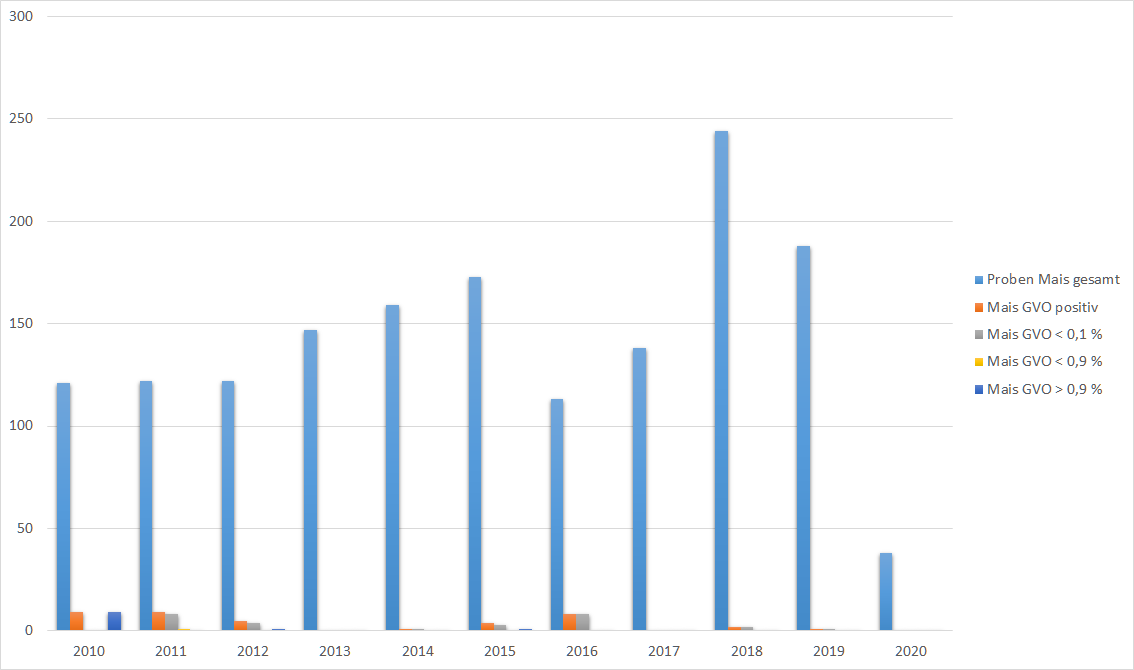 Abbildung 2: Ergebnisse der Untersuchung von maishaltigen Lebensmitteln auf gentechnische Veränderungen in Bayern - 2010 bis 2020