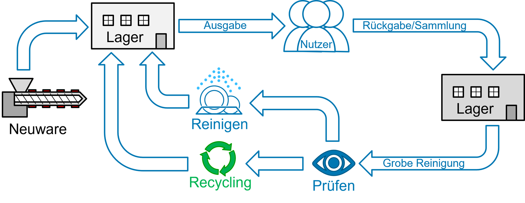 Geschlossene, überwachte Produktkreisläufe stellen die zweite zugelassene Technologie dar. Durch die Überwachung wird eine falsche Verwendung der Gegenstände weitestgehend ausgeschlossen. Als überwacht gelten die Produkte nur dann, wenn sie ausschließlich auf den Geländen der teilnehmenden Firmen (in Abbildung 2 als Nutzer bezeichnet) verwendet werden. Für Mehrwegverpackungen eignet sich diese Technologie somit nicht, da Verbraucher die Behälter mit nach Hause nehmen. Hierdurch ist eine dauerhafte Überwachung der Behälter nicht möglich und eine Fehlnutzung kann nicht ausgeschlossen werden.