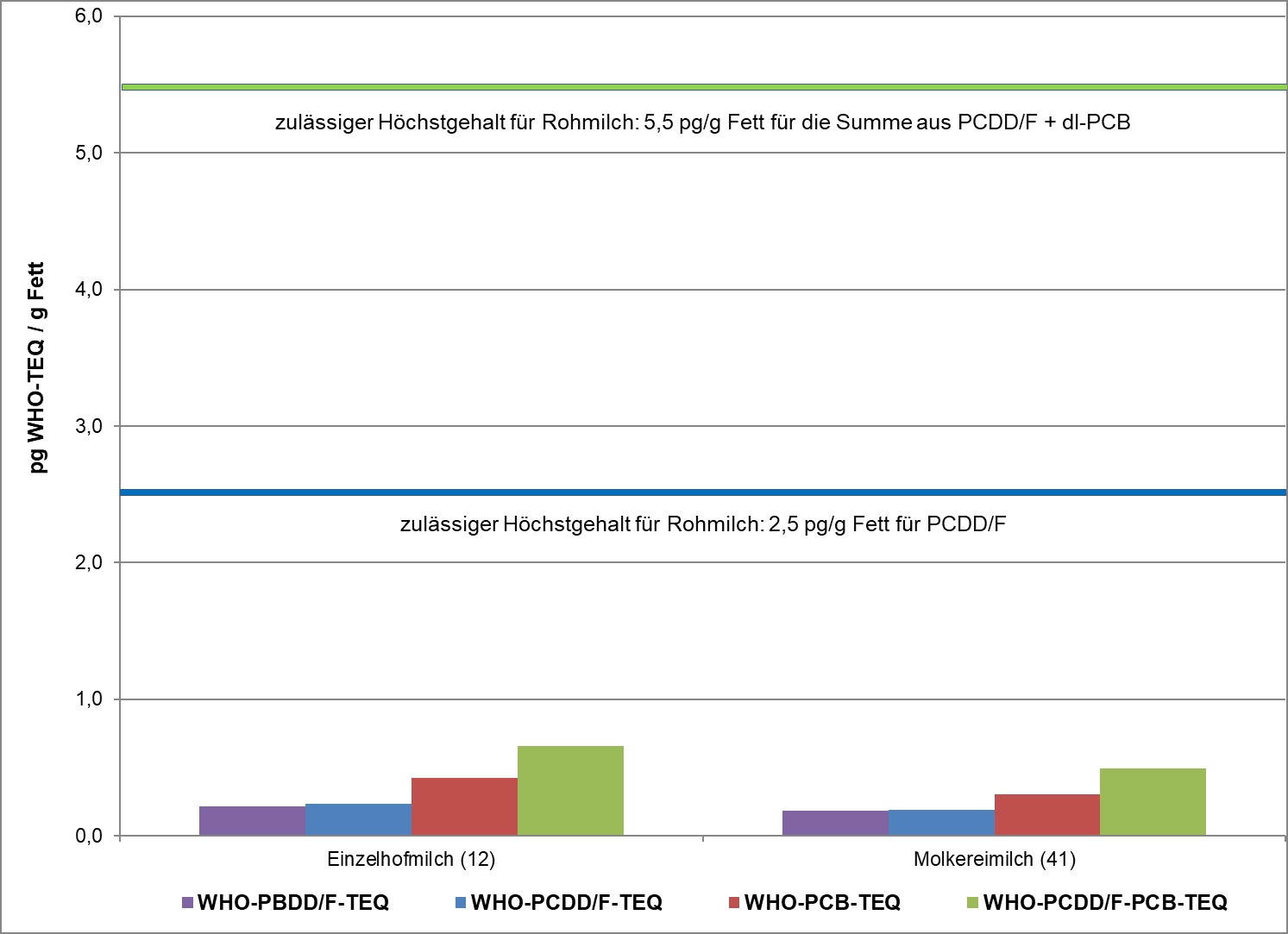Die mittleren Gehalte der ndl-PCB-Summen liegen bei allen Milchproben nur bei etwa 5 % des zulässigen Höchstgehalts von 40 ng/g Fett. Bis auf eine Ausnahme weisen die PBDEetwa nur 30 % der Belastung der ndl-PCB auf. Bei der Milch eines Einzelhofs überschritt der PBDE-Summengehalt den restlichen Durchschnittswert um mehr als das Vierzigfache. Deshalb beträgt der abgebildete PBDE-Mittelwert der Milch aus den Einzelhöfen mehr als das Fünffache des unauffälligen Mittelwerts bei den Molkereimilchproben (siehe Abbildung 2).