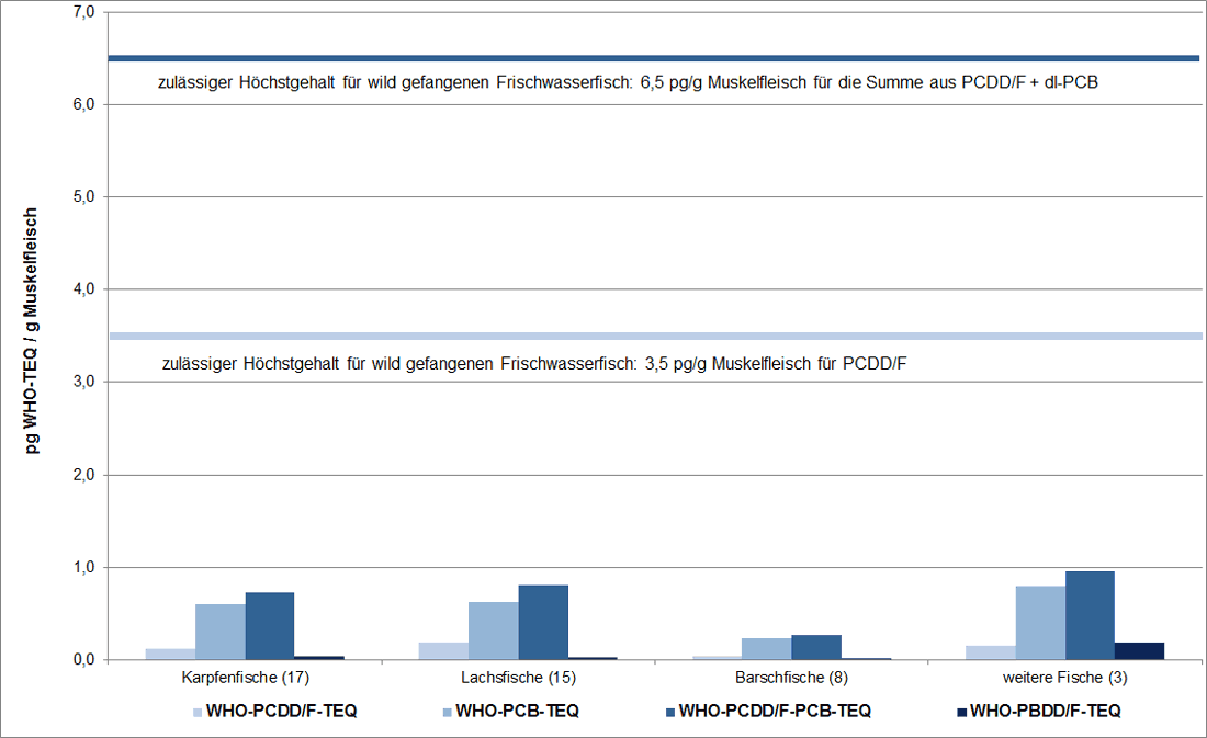 Abbildung 1 zeigt auch die TEQ-Gehalte der bromierten Dioxine und Furane (PBDD/F). In den untersuchten Fischen lag die Belastung mit diesen Stoffen überwiegend unterhalb derjenigen, die durch ihre gleichartigen chlorierten Verbindungen verursacht wird. Höchstgehalte sind für die PBDD/F noch nicht festgelegt. Bei der WHO besteht jedoch die dringende Annahme, dass die mit PBDD/F verursachte tägliche Hintergrundbelastung beim Menschen dem Gesamt-TEQ zuzurechnen sein sollte, da PBDD/F die gleichen charakteristischen Eigenschaften wie PCDD/F aufweisen.