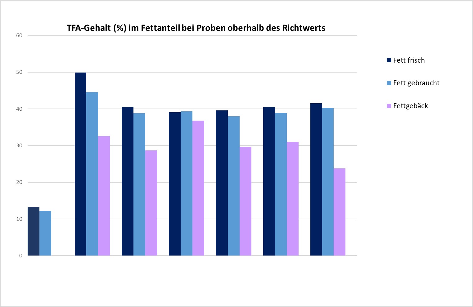 Von den insgesamt 116 Proben Frittierfett wiesen 102 Proben (88 %) keine bzw. nur geringe Transfettsäuregehalte bis höchstens 1,2 % auf. 14 Proben (12 %) überschritten mit Transfettsäuregehalten zwischen 12,2 und 49,9 % deutlich den angestrebten Höchstgehalt von 2 g/100 g Fett. Bei den belasteten Proben handelte es sich um sieben Doppelproben von frischem und gebrauchtem Frittierfett. Die Transfettsäuregehalte in frischem und gebrauchtem Fett unterschieden sich dabei jeweils nur geringfügig. Bei 35 Proben (85 %) der frittierten Lebensmittel, darunter alle 27 Proben Pommes frites, die drei Proben frittiertes Fleisch und fünf Proben Fettgebäck waren Transfettsäuren nicht oder nur in geringen Mengen bis 1,3 % nachzuweisen. Sechs weitere Proben Fettgebäck, das heißt 55 % dieser Produktgruppe, wiesen allerdings sehr hohe Gehalte auf. Sie lagen im Bereich von 23,8 bis 36,8 % Transfettsäuren. Die zum Ausbacken dieser Erzeugnisse verwendeten Fette enthielten bereits Gehalte von 38,0 bis 49,9 % Transfettsäuren. Das Säulendiagramm (s. Abbildung) zeigt die Transfettsäuregehalte der sieben Doppelproben von frischem und gebrauchtem Frittierfett, die über dem Richtwert von 2 % lagen, sowie der parallel eingegangenen sechs Fettgebäcke. Es verdeutlicht, in welchem Umfang ein Übergang der Transfettsäuren auf das Frittiergut erfolgt.