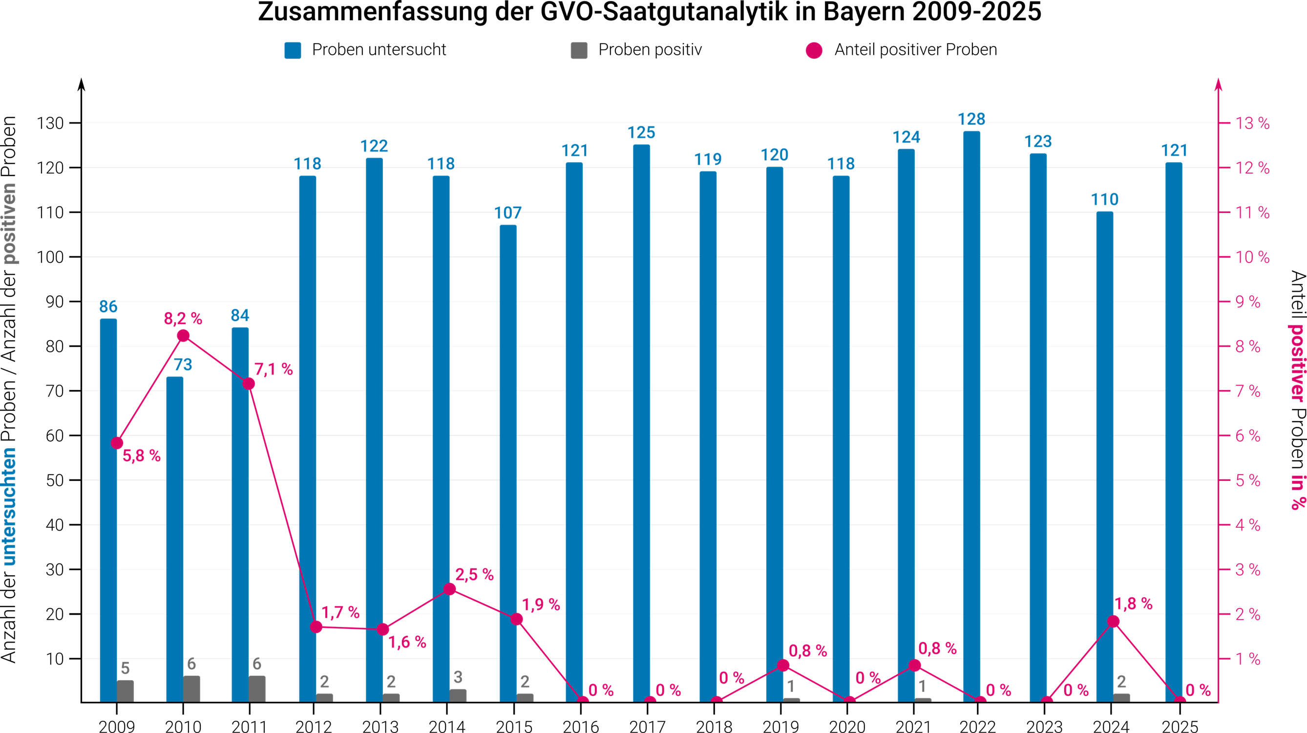 Das LGL hat für die Aussaat in den Jahren 2009 bis 2025 die unten aufgeführten Saatgutproben auf gentechnisch veränderte Bestandteile untersucht. Die Proben wurden von der Bayerischen Landesanstalt für Landwirtschaft (LfL) im Rahmen der Saatgutverkehrskontrolle in Betrieben des Saatguthandels gezogen. Positive Analyseergebnisse wurden den zuständigen Regierungen mitgeteilt, welche die Rückholung des betroffenen Saatguts veranlasst und überwacht haben.