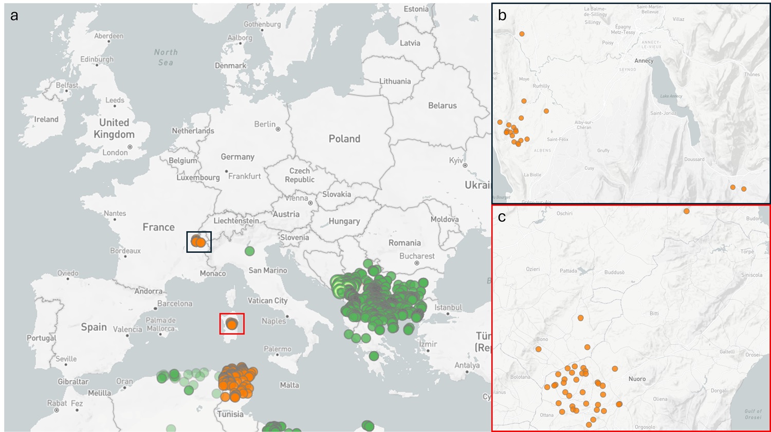 (a): Übersicht; (b): Ausschnitt aus Übersicht (a) (schwarzer Rahmen), Region Auvergne-Rhône-Alpes in Frankreich; (c): Ausschnitt aus der Übersicht (a) (roter Rahmen), Region Sardinien.
